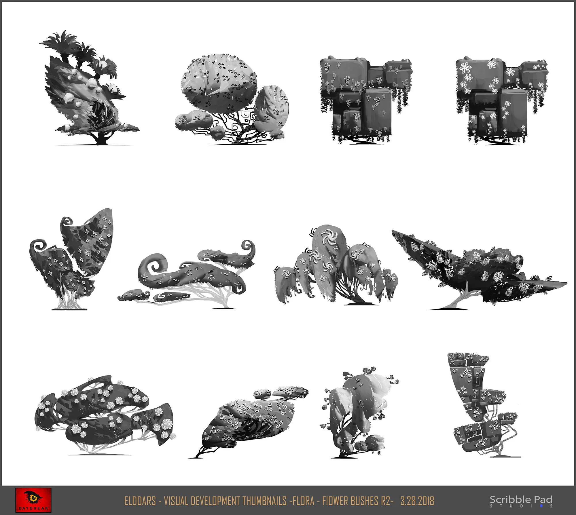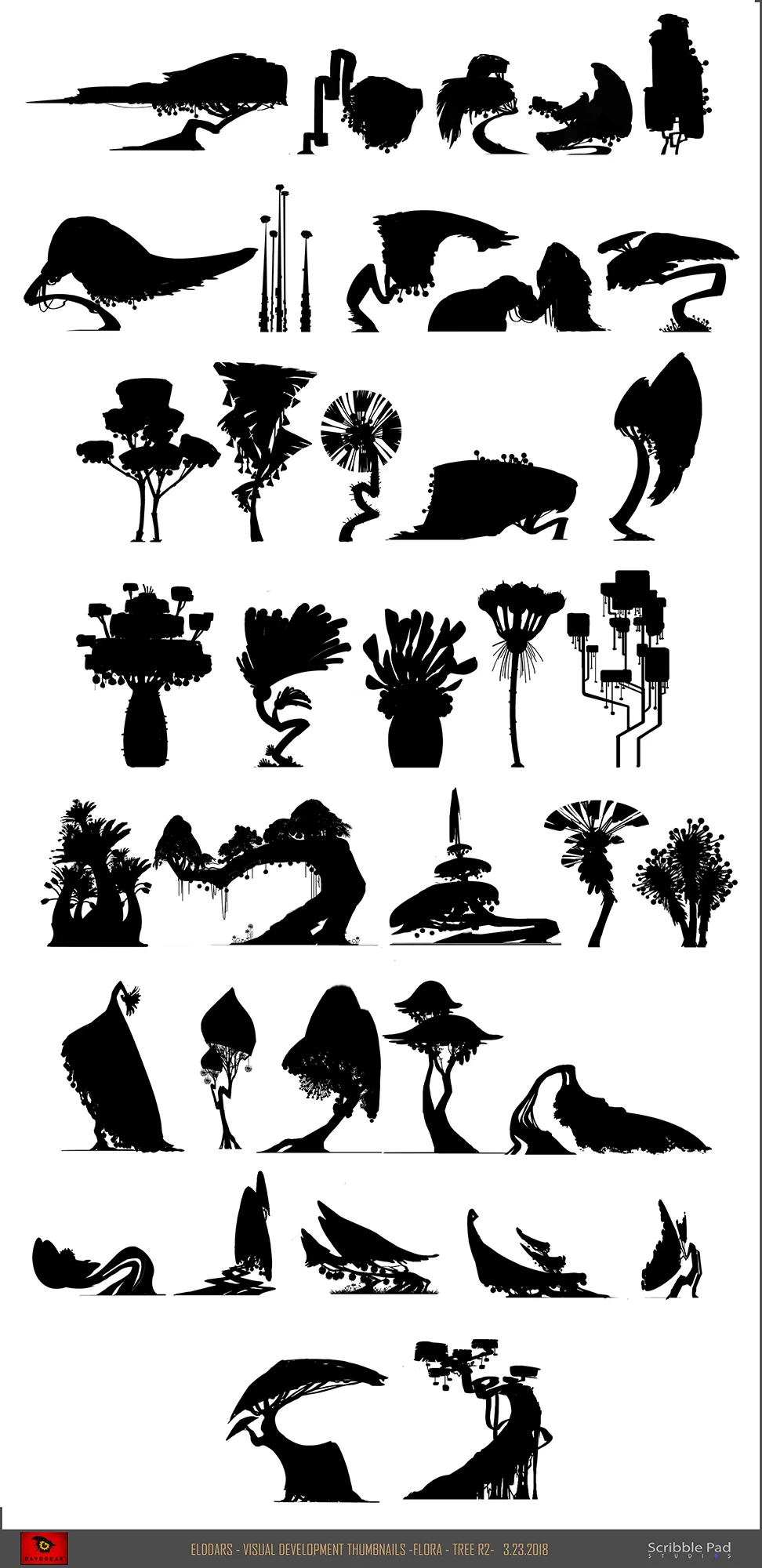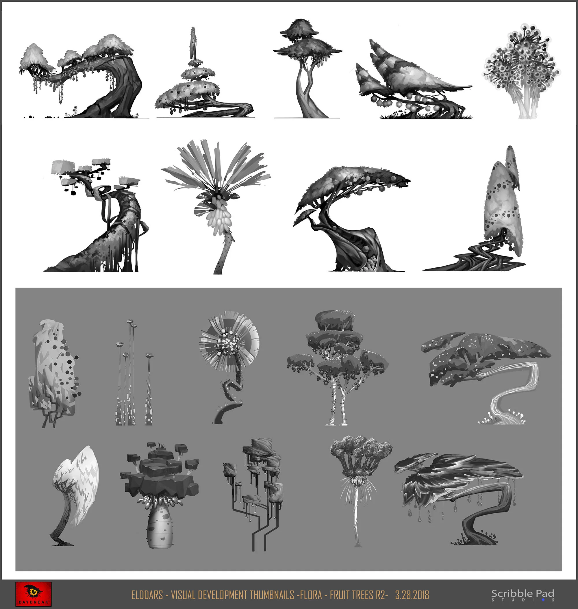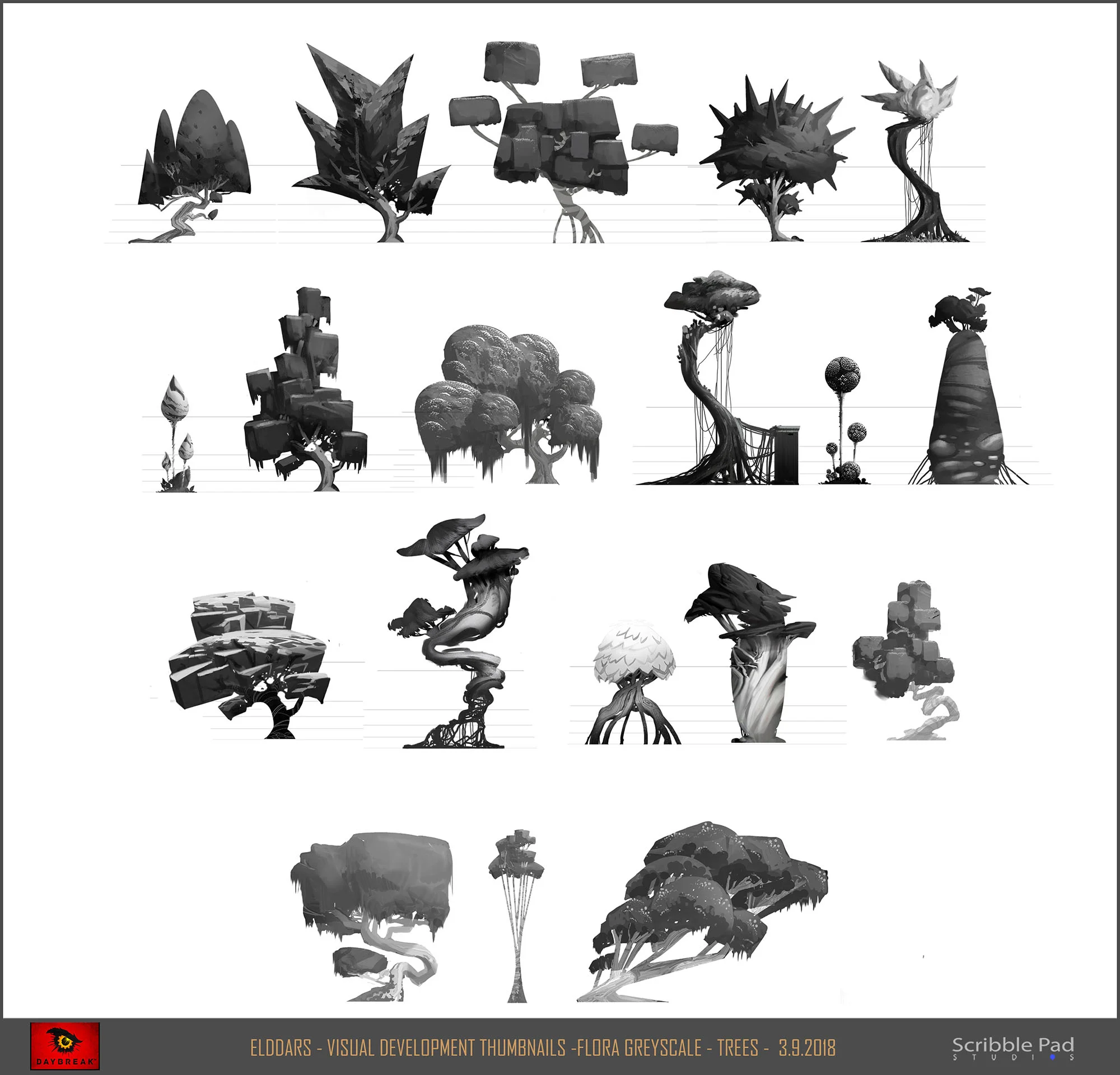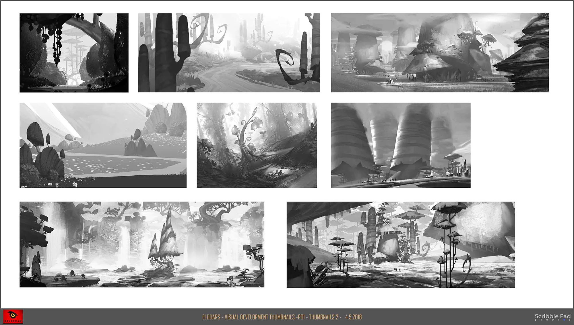With the elements figure out, thumbnails can now be generated for the Elddar Forest. The concept artists generated a wide variety of locations and biomes within the forest.