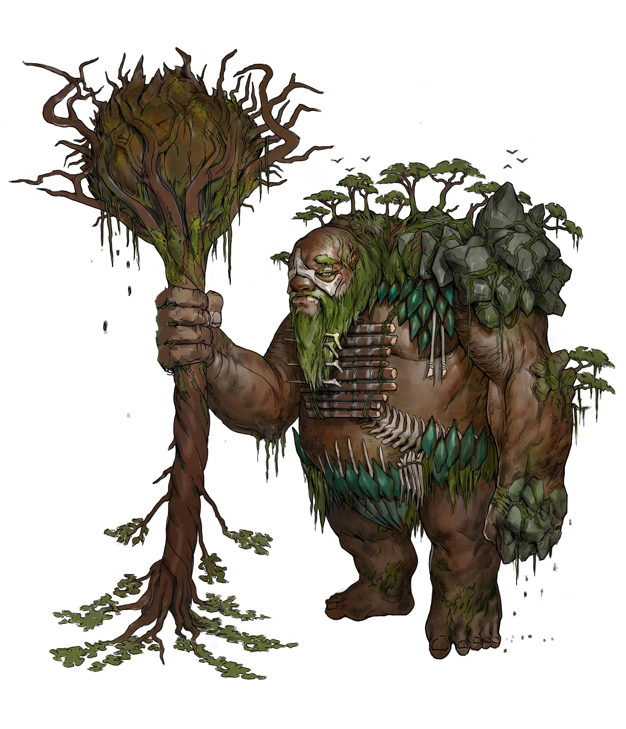 The bone armor and scales come from its arch nemesis, a forest dragon. They provide a basis for the large scale of the Hill Giant but the log necklace, grass and moss growth on his skin, and trees on his back show just how immense this character is in the world.