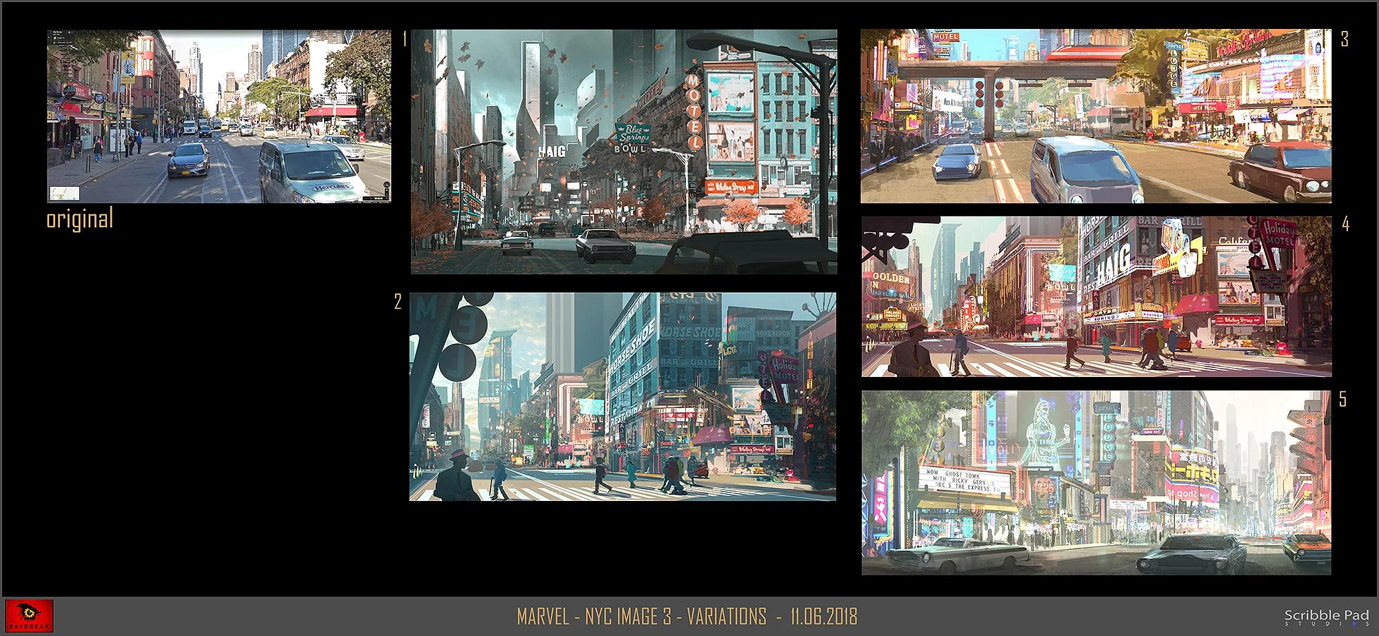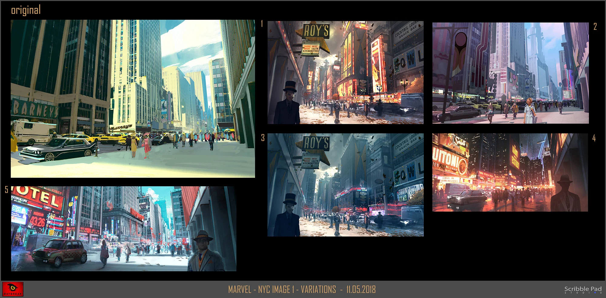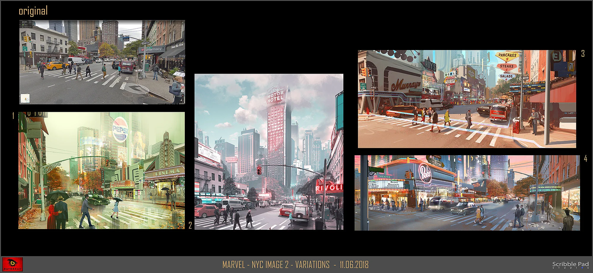 The following concept art was further exploration of transforming the streets of NYC into this alternate early 60’s art look that never seem to have left (See the earlier post of Times Square Mid-Century Modern Pre-visualization for more details on the art direction).