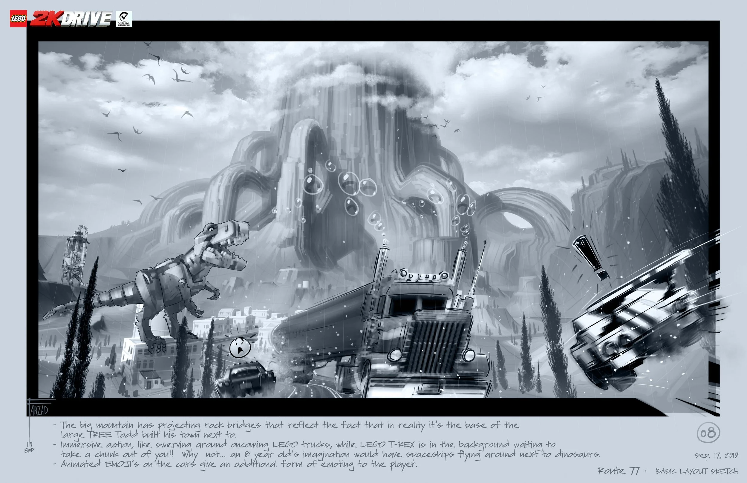 Early in the visual development of LEGO 2K Drive, I hired Farzad Varahramyan to help me envision a unique take on the real-world, natural elements of the game world, including foliage and rock formation designs. Our idea was to use LEGO bricks and elements to influence the shape language of the different rock formations for each biome. For example, the desert biome, known as Big Butte, adopted the shape language of more linear bricks such as the 2x2, 2x6, and 2x8 rectangular classic bricks. In contrast, the rocks in Prospecto Valley were modeled after the category of bricks known as “roof” elements or angled top bricks.
