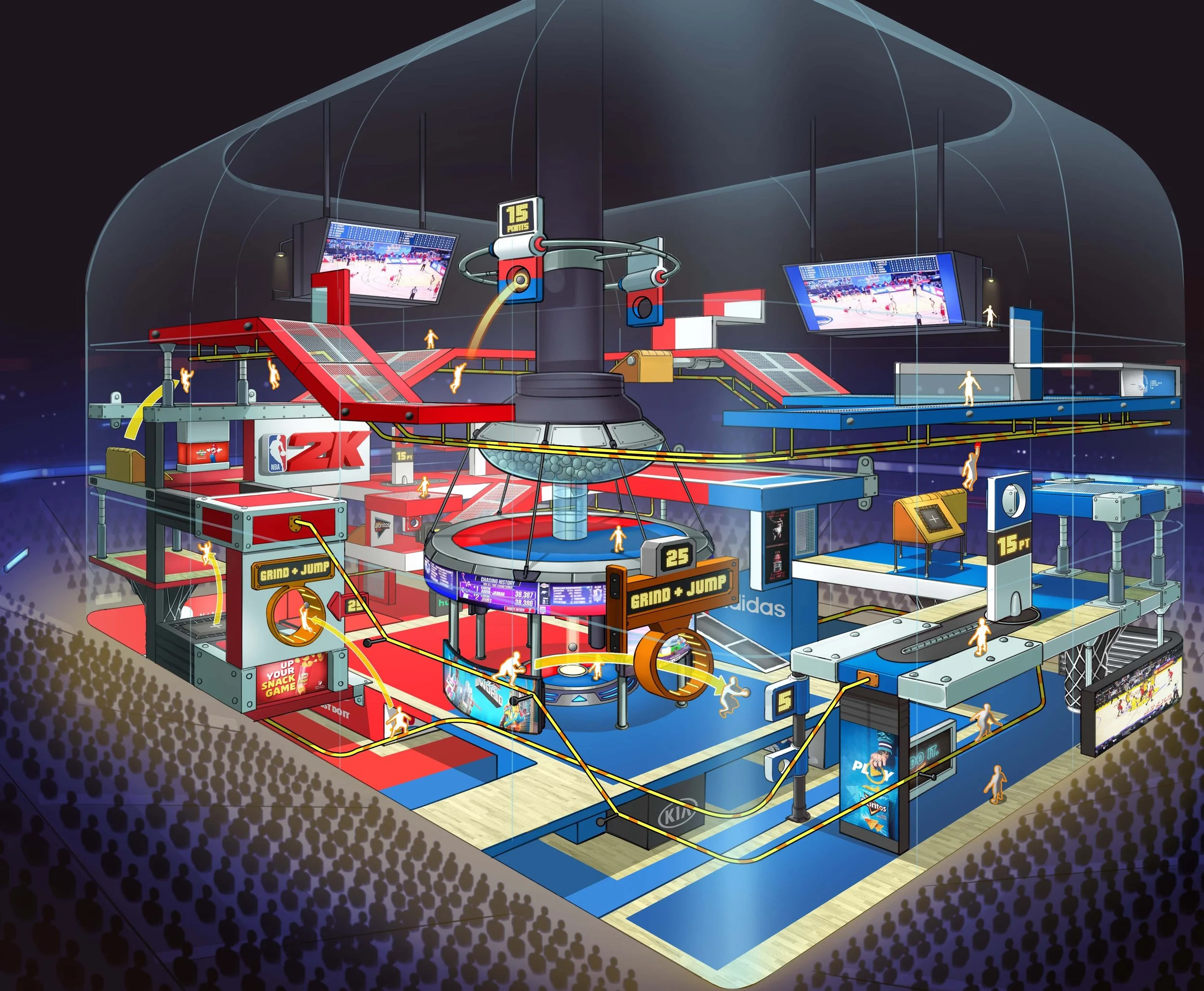 Concept art often explored layering gameplay space like an arena shooter, with chokepoints, sightlines, and flanking routes—recontextualized for basketball.