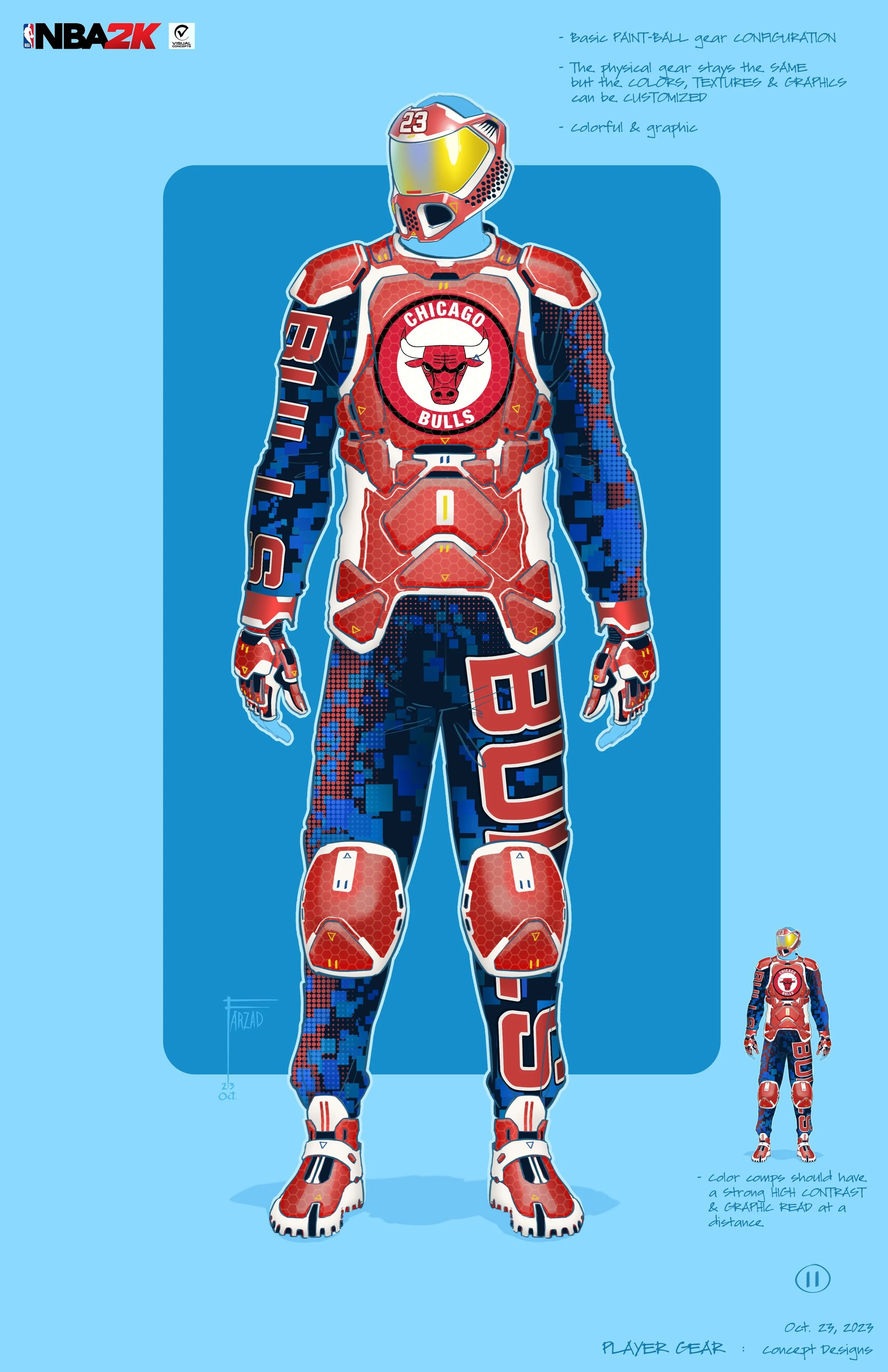 We began with grounded explorations: sleek athletic silhouettes inspired by traditional sportswear, with form-fitting uniforms, tactical gear, and team-based color schemes. These initial designs emphasized function—ergonomics, mobility, and team identity. We studied contemporary sports like basketball, roller derby, and even fencing, to understand how uniforms can amplify both performance and personality. This established the baseline look for a competitive sport grounded in some sense of realism.